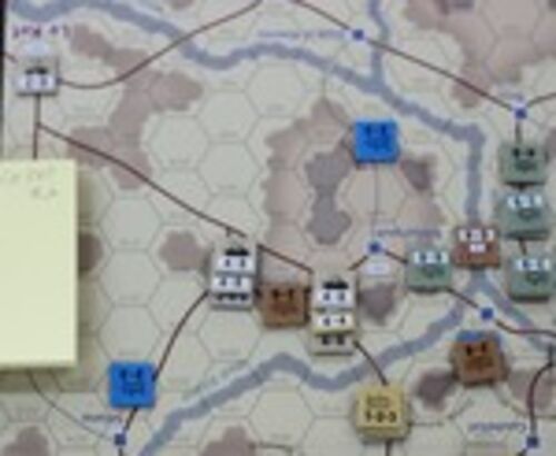 第1ターンの空港強襲に失敗して戦力を失った連合軍ですが、全体のVPを数えると現状は枢軸群勝利なので止む無く攻勢を続けます。 第2ターンは、ジェベル・ブクリンの対戦車砲を砲兵支援を受けて攻撃します。この位の敵なら強力な連合軍砲兵支援を持ってす…